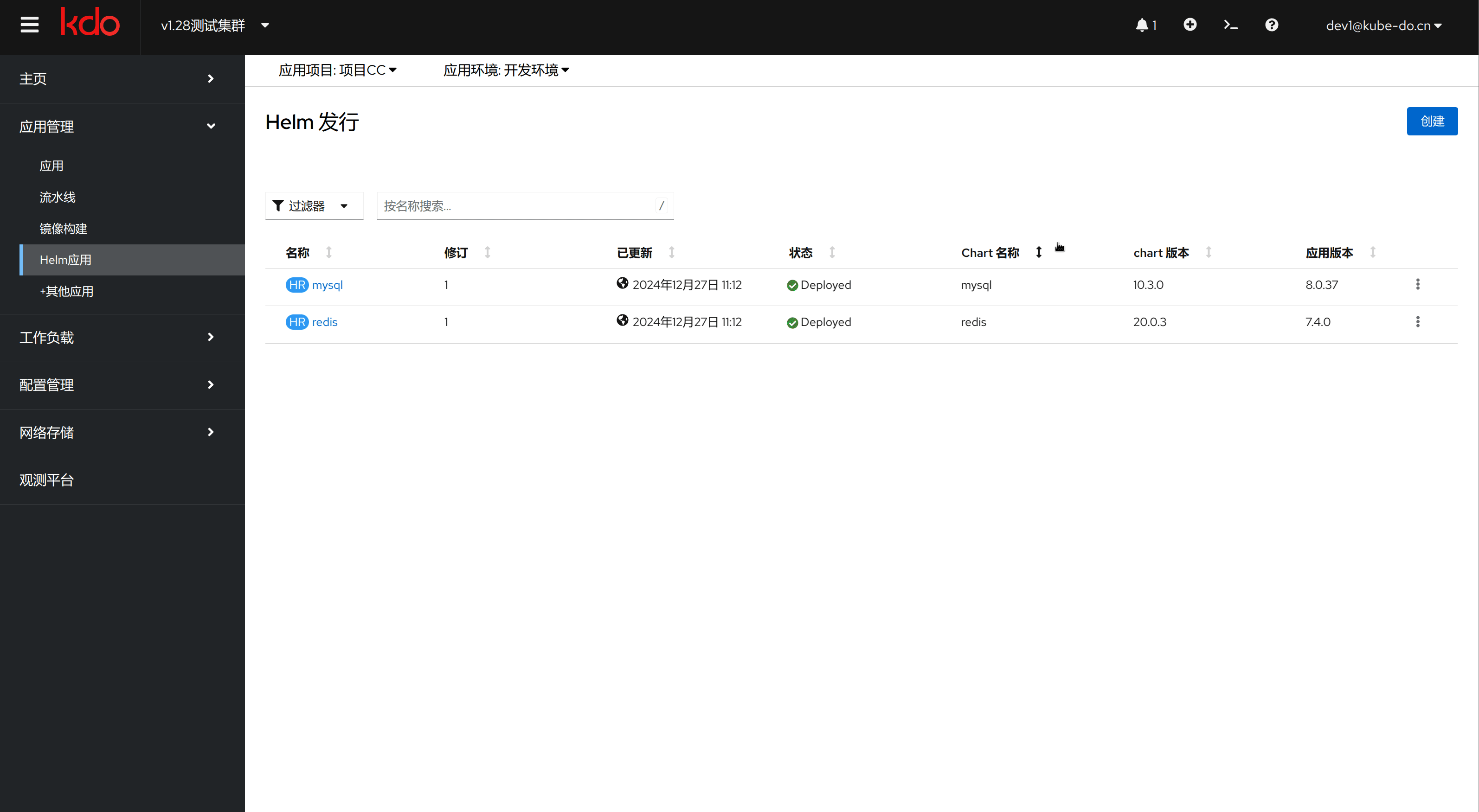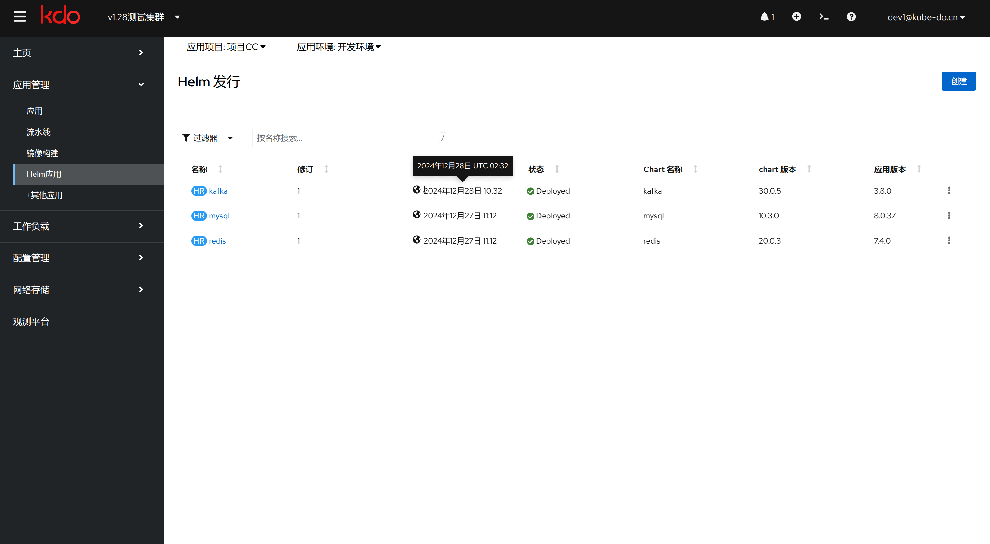 点击对应的Helm应用,您可以执行多种管理操作,包括更新或删除该Helm应用。 此外,您还能查看当前Helm应用的详细信息,如版本号、安装时间等重要数据。 对于需要进行版本控制和回滚操作的情况,系统还提供了历史版本的浏览功能。