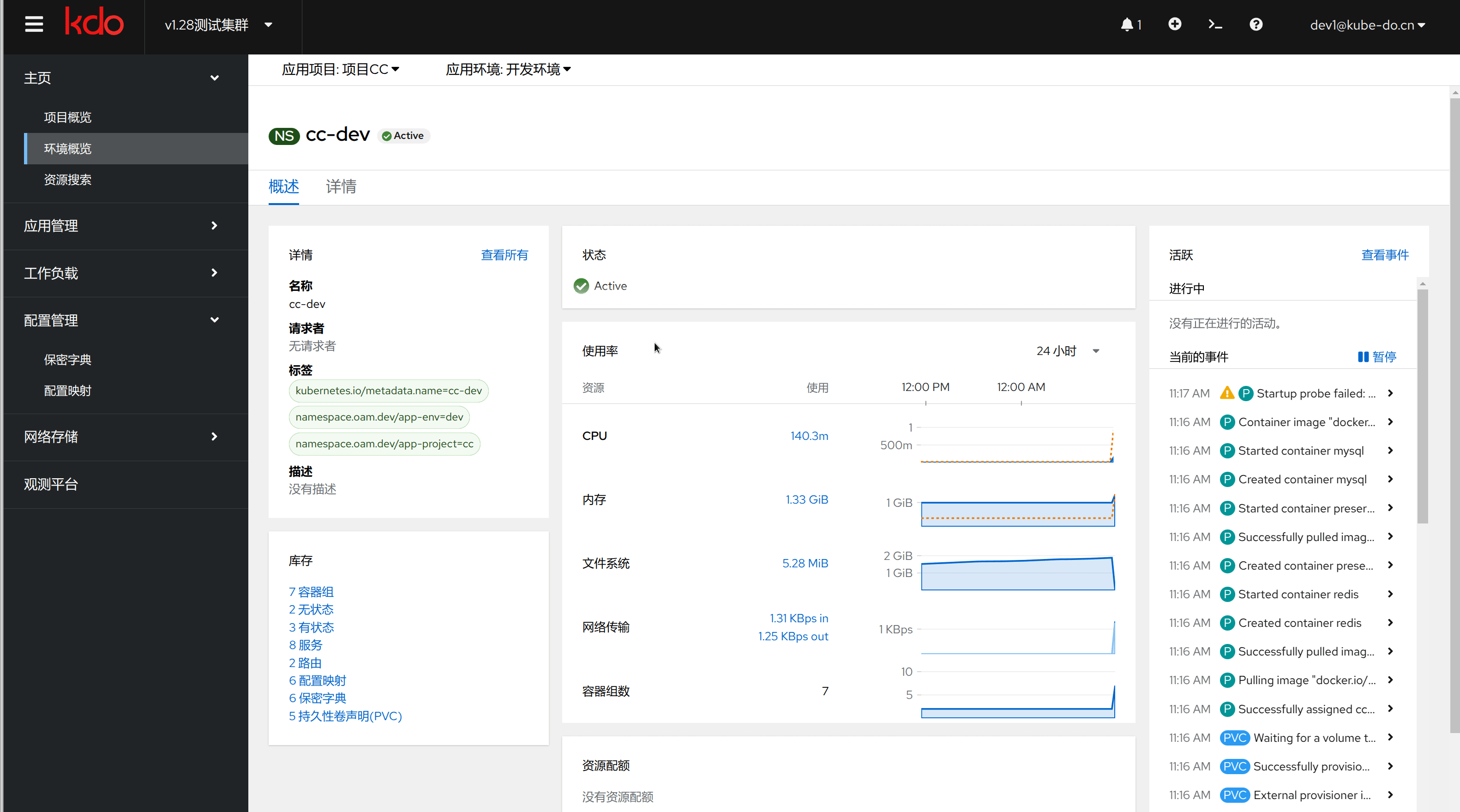 在环境概览页面,可以对当前项目的当前环境有个整体认识,包括基本信息、资源使用、监控信息、事件等,点击对应链接可以直接访问对应的资源。
