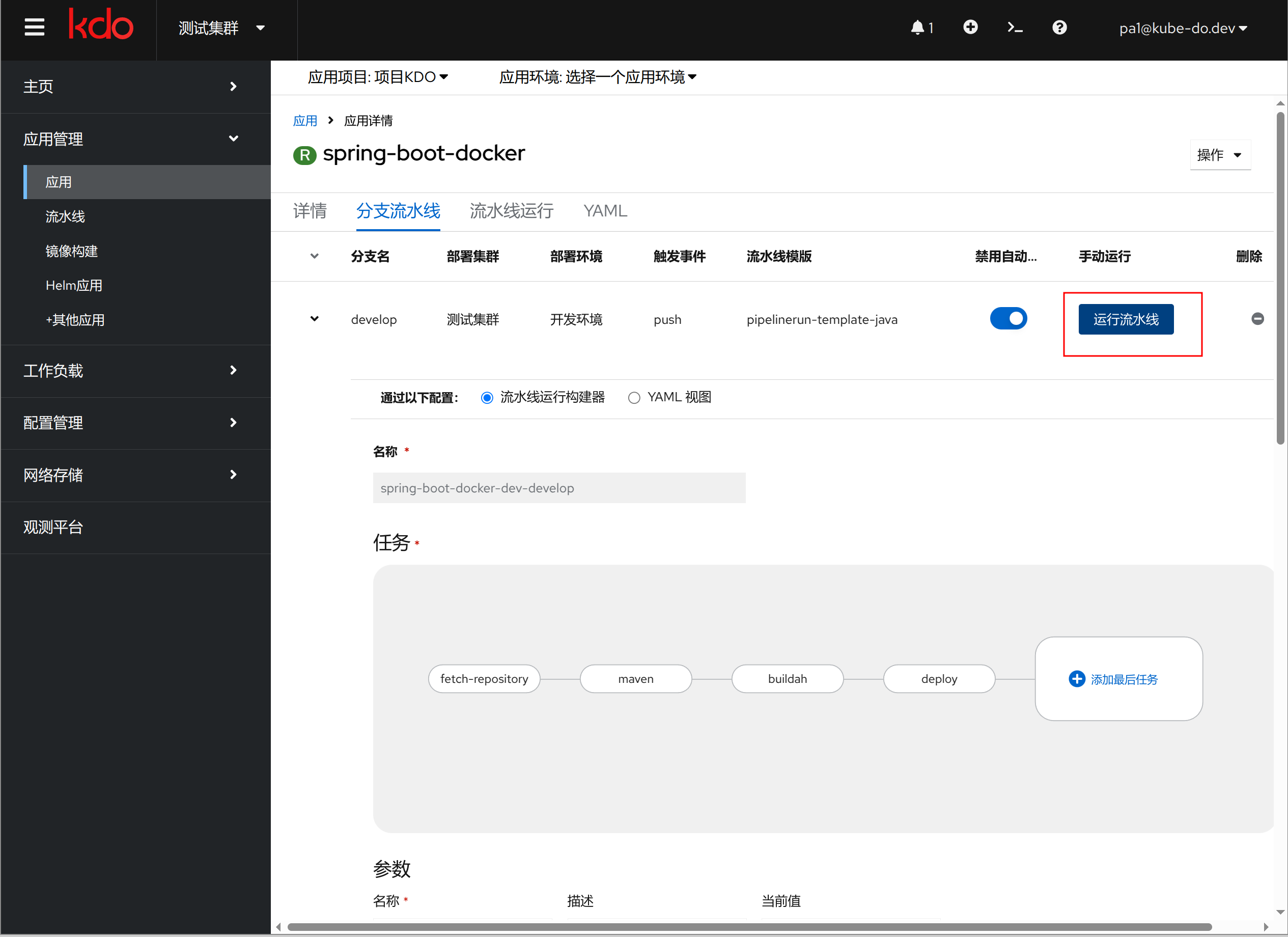 页面,选择一个分支,点击运行流水线,就可以进行应用构建和部署了。