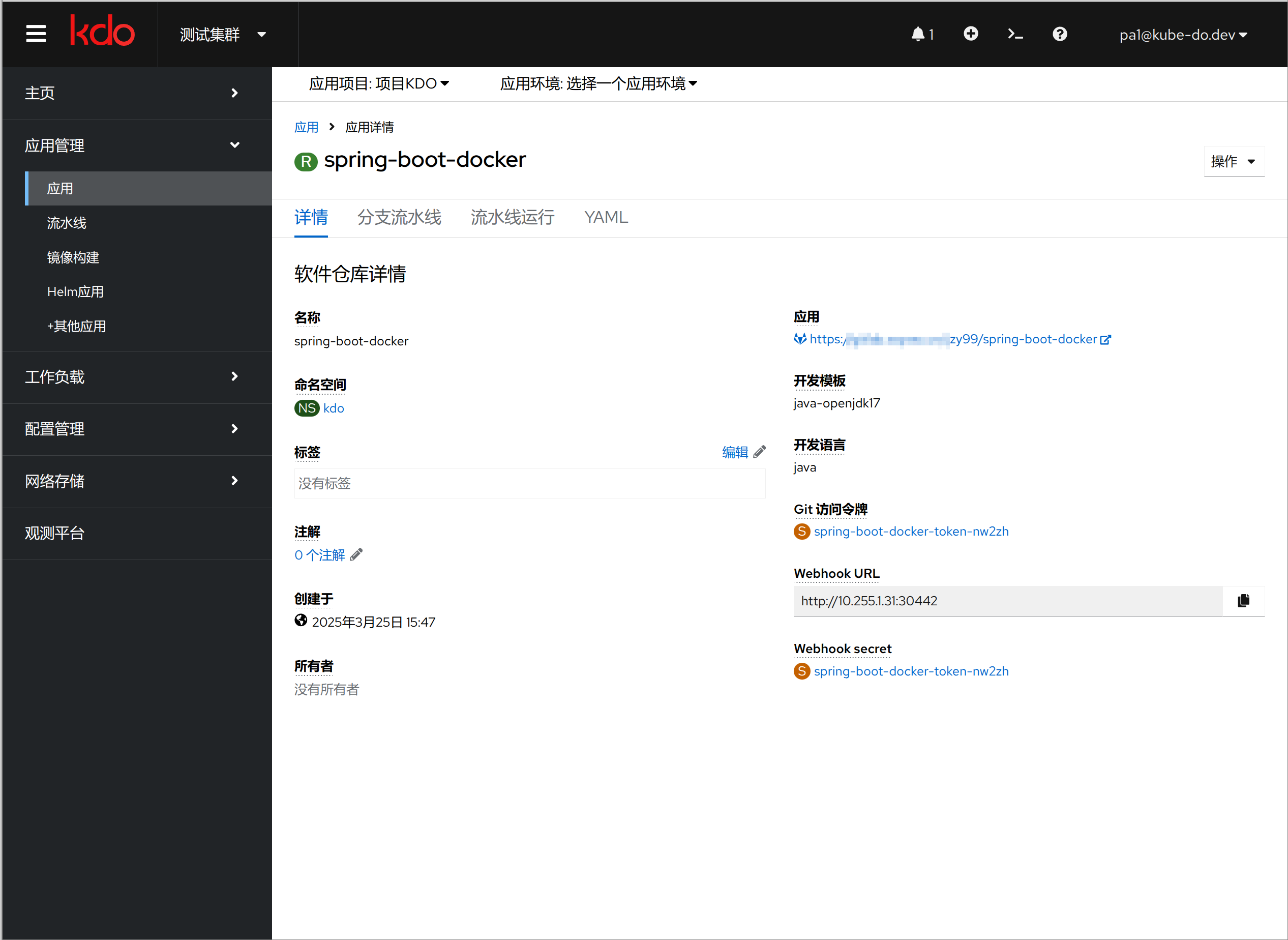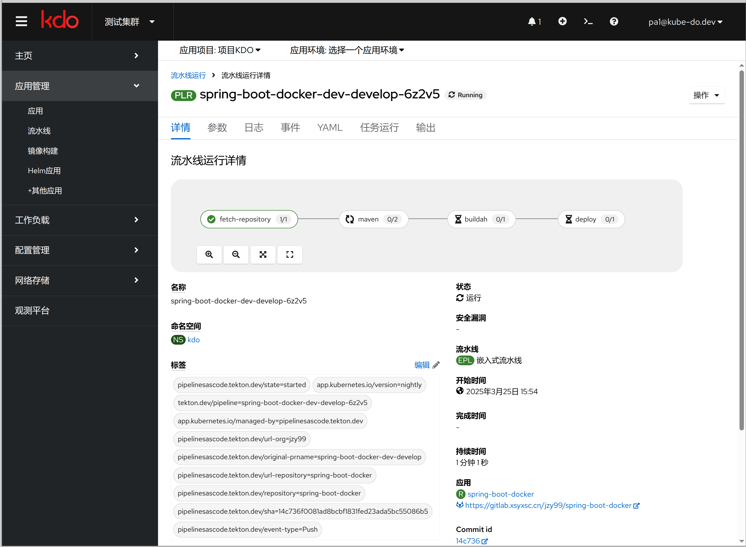 页面,选择对应的流水线运行,就可以查看流水线运行信息了。更多信息 - KDO平台会在项目内创建一个持久存储卷PVC,用来缓存这个项目所有应用安装包(包括