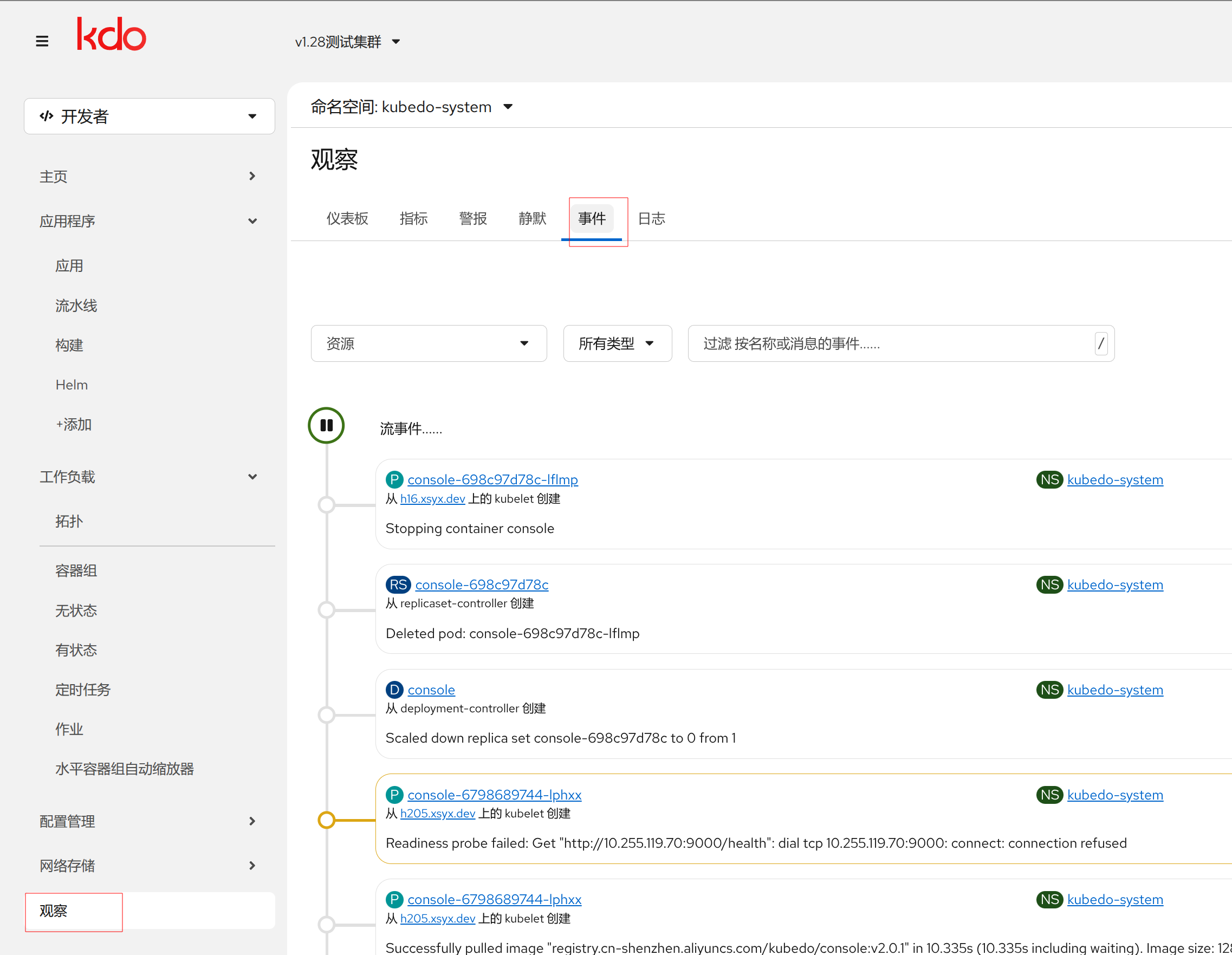 在KDO平台中,用户能够对资源对象的事件进行灵活过滤,并且可以通过关键字快速查找特定事件。 这种强大的事件管理功能允许您根据具体需求定制视图,精准定位到关心的事件信息。