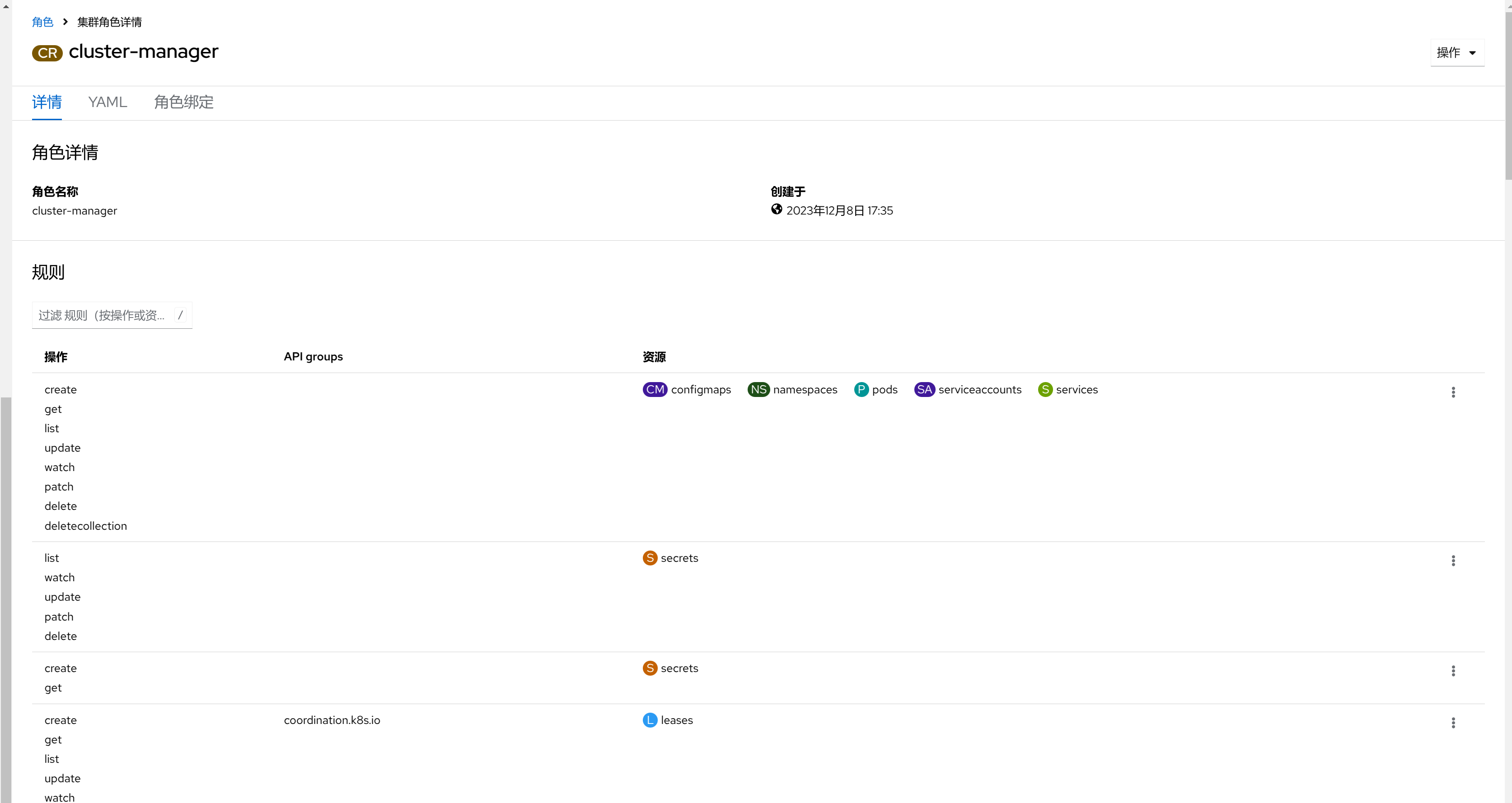 - 角色(Role): 用于定义对命名空间内资源的访问权限。Role只能用于授予对某个特定命名空间中资源的访问权限。