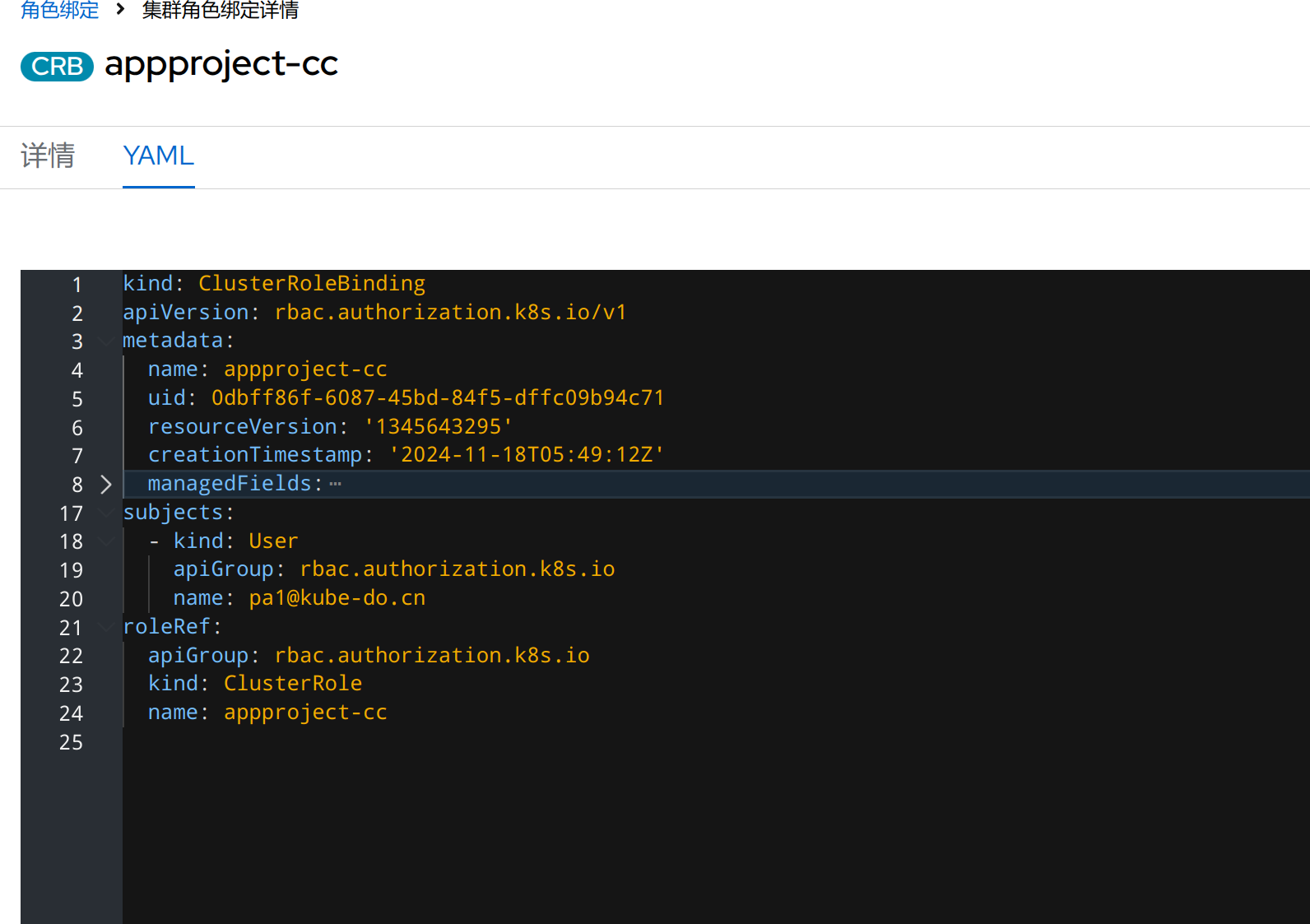 - 集群角色绑定(ClusterRoleBinding): 用于将ClusterRole绑定到一个或多个用户、服务账户或用户组,控制这些实体对集群范围内资源的访问。