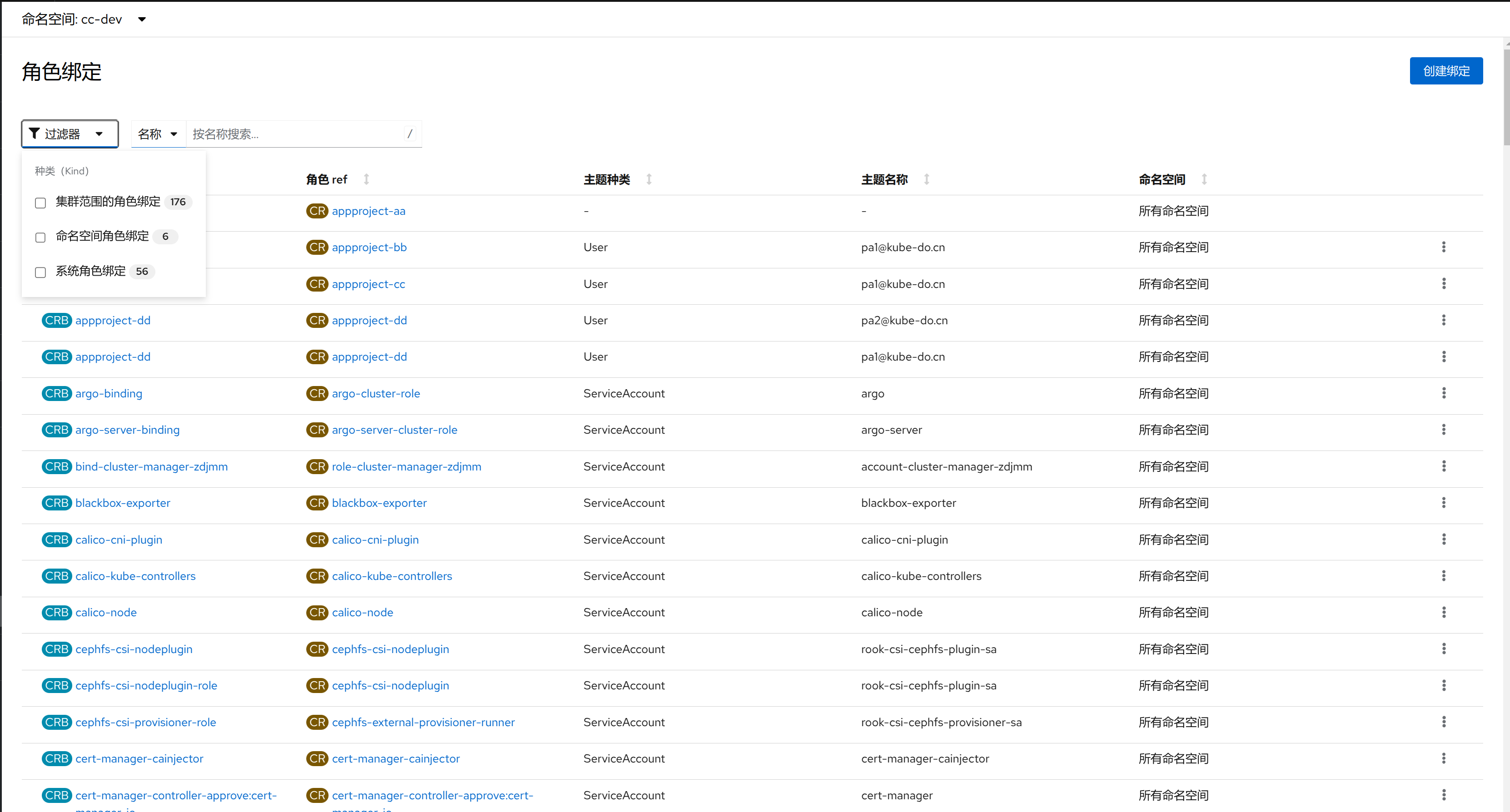 - 如果你希望将某 集群角色(ClusterRole) 绑定到集群中所有名字空间,你要使用 集群角色绑定(ClusterRoleBinding)。 角色绑定(RoleBinding) 或 集群角色绑定(ClusterRoleBinding) 对象的名称必须是合法的路径分段名称。