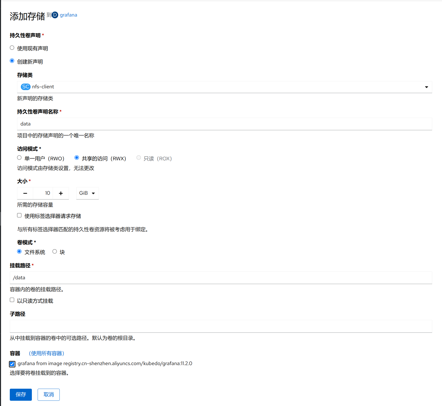 添加存储到容器组有两种方式,一种是使用现有持久性卷声明(PVC), 另外一种是创建一个新的持久性卷声明。