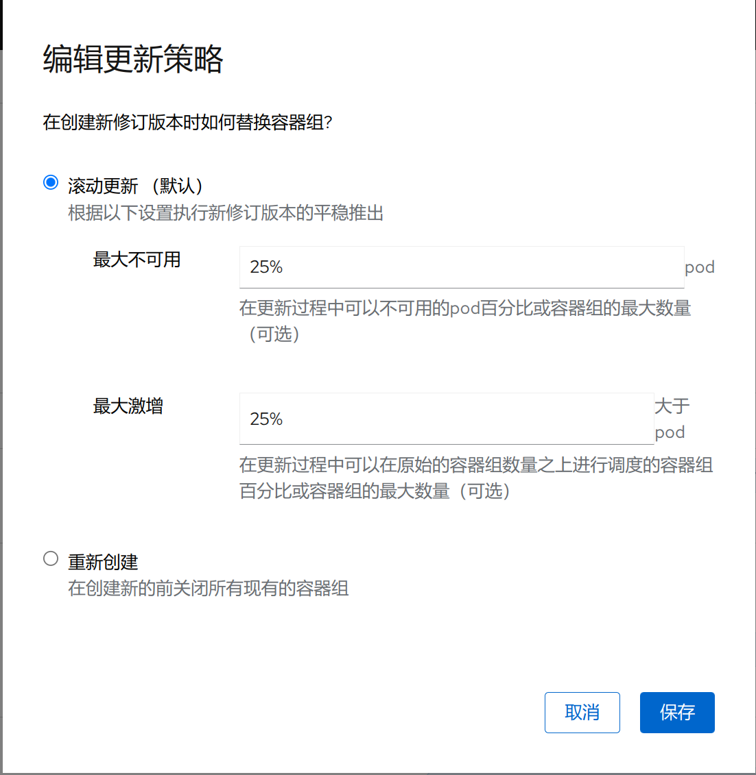 可能不可用,并且可能会创建多达 25% 的新版本 容器组(Pod)